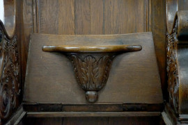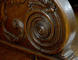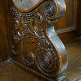 Panca a due posti in rovere, fine XVIII secolo, schienale curvo, sedili richiudibili, braccioli mossi e particolari scolpiti a rilievo a motivo di tralci di vite ed uva, cm h 113x144,5x45,5, (difetti)