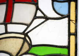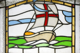 Pannello in vetro piombato con decoro policromo raffigurante veliero, struttura in metallo dorato, cm 10x51x61,5, (difetti).