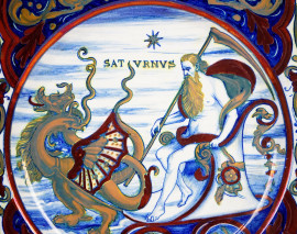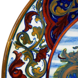 Piatto da parata in ceramica a lustro, Mastro Giorgio, Gualdo Tadino, prima metà del XX secolo, decoro raffigurante il Carro di Saturno, diam. cm 35, (lievi difetti)
