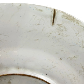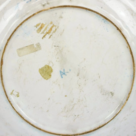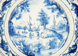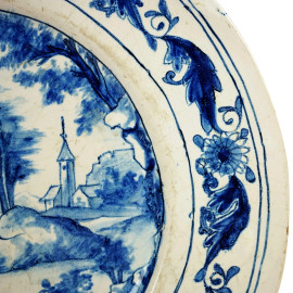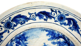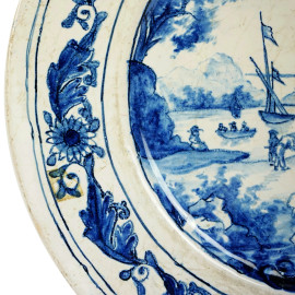Piatto in ceramica bianco e blu, decoro raffigurante paesaggio marino con figure, tesa a motivi floreali, diam. cm 24,5, XVIII secolo, (sbeccature).