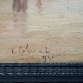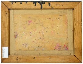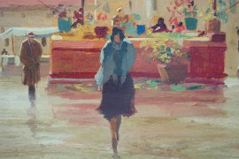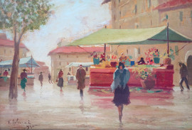 Piazza con mercato e figure, olio su compensato, cm 24,5x33,5, firmato, entro cornice.