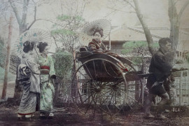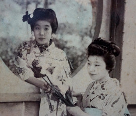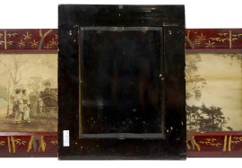 Quattro fotografie d'epoca raffiguranti scorci paesaggistici con donne orientali, cm 26,5x0,5, arte orientale, inizi XX secolo, entro cornici laccate, (segni del tempo).