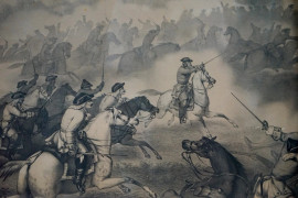 Quattro stampe raffiguranti scene di battaglie, cm 52x61,5 circa, XX secolo, entro cornici, (difetti).