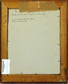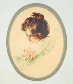 Ritratto di donna con mazzo di fiori, tecnica mista su carta ad assetto ovale, cm 13x10, firmato e datato, entro passepartout e cornice.