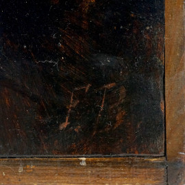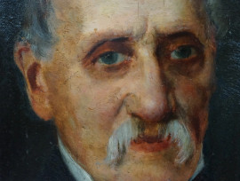 Ritratto d'uomo con baffi, olio su tavoletta, cm 23,5x21, siglato, entro cornice.