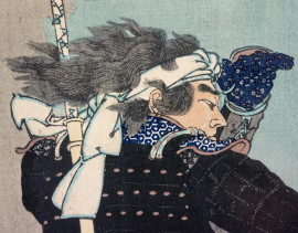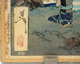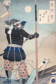 Sakai Tadatsugu sprona le truppe nella Battaglia di Nagashino, multiplo a colori da Yoshitoshi (1839-1892), cm 34,5x24,5, Giappone, (difetti).