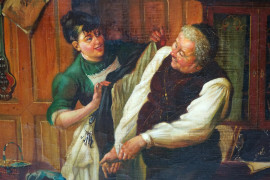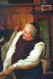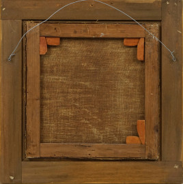 Scena di interno, olio su tela, cm 45x45, fine XIX-inizi XX secolo, entro cornice
