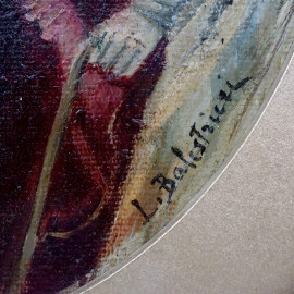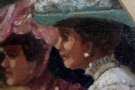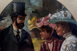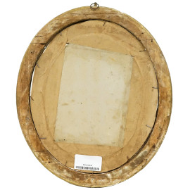 Scena galante, olio su tela riportata su cartone ad assetto ovale, cm 25x20, firmato, entro cornice.