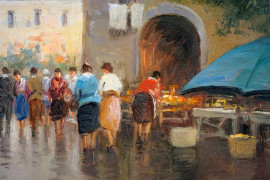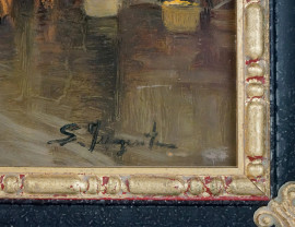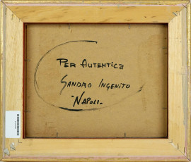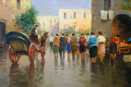 Scorico di piazza con figure, olio su cartone, cm 24x30, firmato, entro cornice.