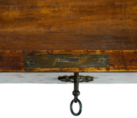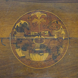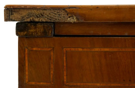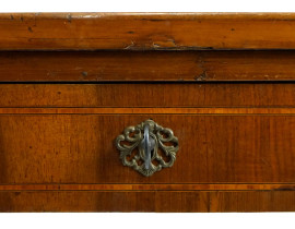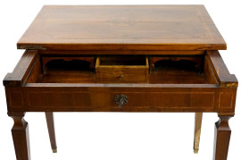 Scrittoio in noce con intarsi e filetti a vari legni, XIX secolo, piano scorrevole celante un cassettino e vuoti all'interno, quattro gambe troncopiramidali, cm h 77x97x67, (difetti).