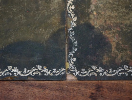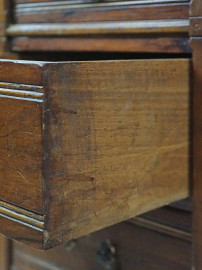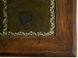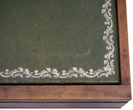 Scrivania ministeriale in noce, fine XIX-inizi XX secolo, piano rivestito in pelle verde, fronte a nove cassetti, cm 80x130x69,5, (difetti)