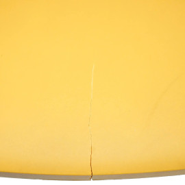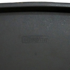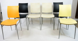 Sei sedie Coco Cassina, struttura in metallo satinato, sedute e schienali in materiale plastico di colore nero, bianco, arancio e giallo, cm h 80, (difetti)
