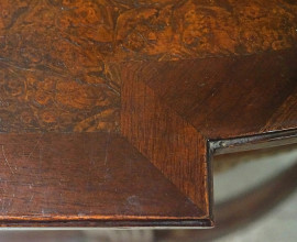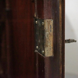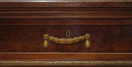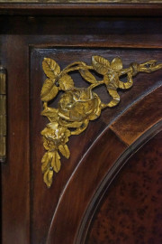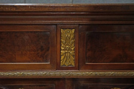 fronte a quattro cassetti e quattro sportelli di cui due laterali a vetri, piedi a cipolla, finiture in bronzo, cm h 99x210x53, (lievi difetti).