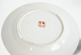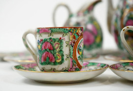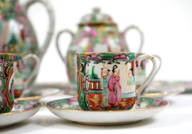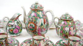 Servizio da thè in porcellana, Cina, XX secolo, composto da teiera, lattiera, zuccheriera, sei tazzine, tre piattini piccoli, nove piattini grandi, (servizio incompleto)