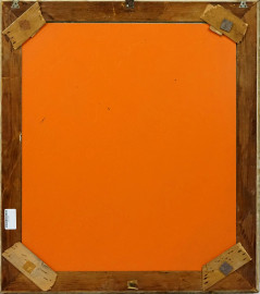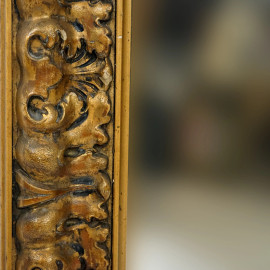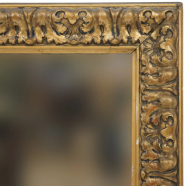 Specchiera in legno intagliato e dorato, inizi XX secolo, battuta decorata a motivi fogliacei, ingombro cm 85x74, misure luce cm 69x59, (difetti).