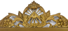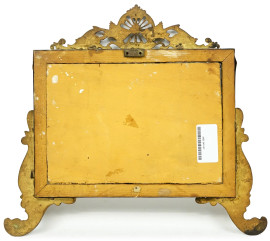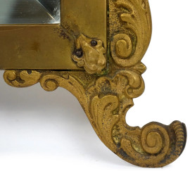 Specchiera rettangolare in legno rivestita in metallo dorato, cimasa lavorata con occhio onnisciente e volute, piedini a ricciolo in bronzo, h 36, prima metà XX secolo, (difetti).