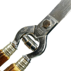 Tagliere in legno con tre posate da arrosto, misure max cm 10x38x25, XX secolo, (difetti).