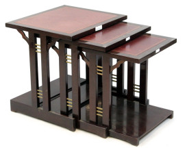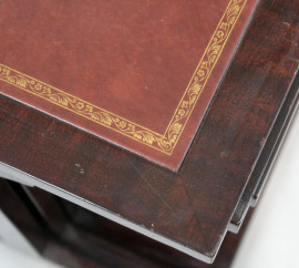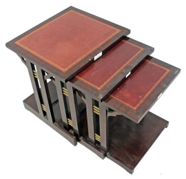 Tavolino a nido in mogano, XX secolo, piani con inserti in pelle, cm h 51x50x45, (difetti)
