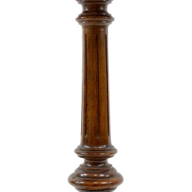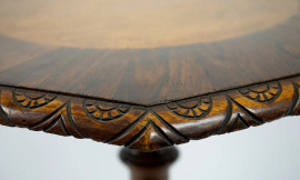 Tavolino di linea ottagonale in noce, inizi XX secolo, piano con profilo intagliato, montante tornito poggiante su tre gambe sagomate, cm h 77x62,5, (difetti).