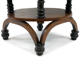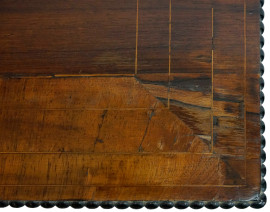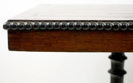 Tavolino di linea rettangolare, inizi XX secolo, piano con particolari filettati sostenuto da quattro montanti ebanizzati e torniti riuniti da pianetto rialzato alla base, cm 76x103x51, (difetti).