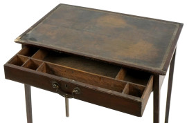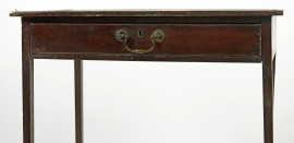 Tavolino di linea rettangolare, XIX secolo, ad un cassetto nella fascia, quattro gambe a spillo, cm h 73x61x39,5, (difetti e restauri).