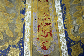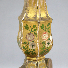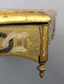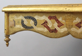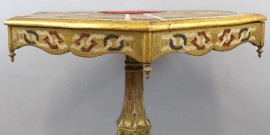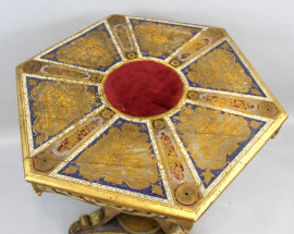 Tavolo da centro in legno dorato, XIX secolo, piano di linea esagonale con inserto centrale in velluto rosso, dettagli floreali intagliati e particolari smaltati, fusto scolpito poggiante su tre piedi mossi riuniti da pianetto triangolare, cm h 77,5x76, (difetti e mancanze).