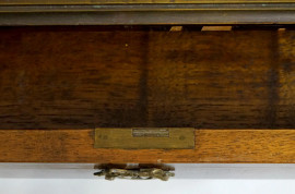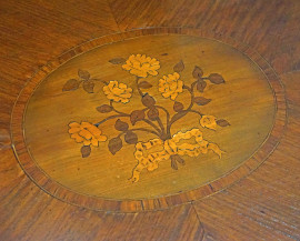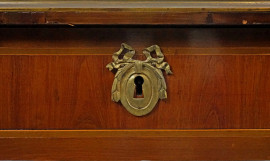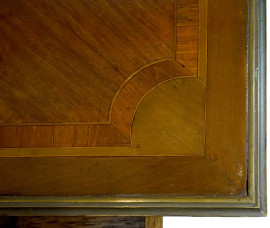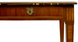 Tavolo scrittoio stile Luigi XVI impiallacciato in vari legni, piano di linea rettangolare, due cassetti nella fascia, quattro gambe a obelisco rovesciato, boccachiavi, scarpette e finiture in bronzo, cm h 76,5x131x70, (difetti).