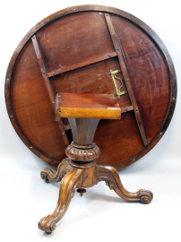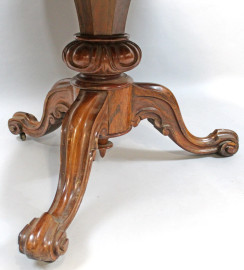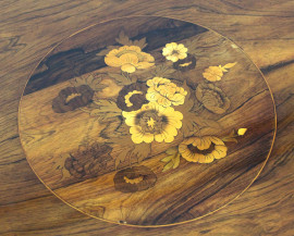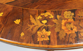 Tavolo tondo in noce, XIX secolo, piano intarsiato in varie essenze a motivo floreale, gamba centrale a balaustro sostenuta da tre piedi sagomati ed intagliati, cm h 83, diam.cm 136, (lievi difetti e segni del tempo).