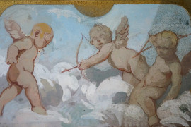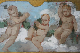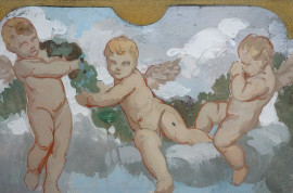 Tre studi di fregi con putti, tempera su carta, cm 9,5x15, inizi XX secolo, entro cornici, (lievi difetti).