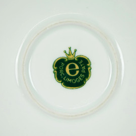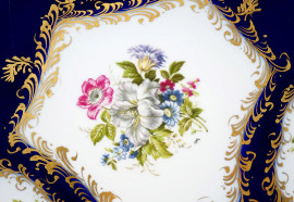 Vassoio di linea circolare in porcellana Limoges, XX secolo, decori policromi su fondo blu, diam. cm 31,5