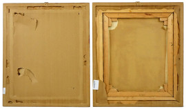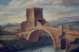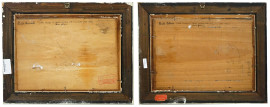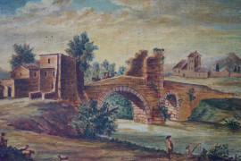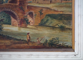 Vedute di ponti romani, coppia di dipinti ad olio su tavola, cm 28x40, firmati, entro cornici.