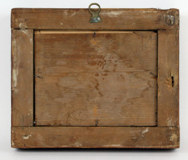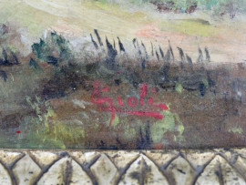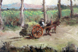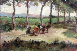 Viale alberato con carro, olio su tavola, cm 15x20, firmato, entro cornice.