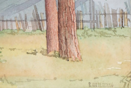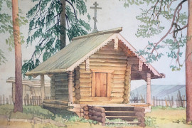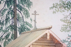 Chiesa di montagna, acquarello su carta, cm 28x40 circa, entro cornice.