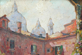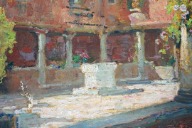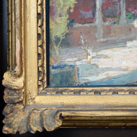 Affaccio sul cortile, olio su compensato, cm 24x20, firmato E. Bonivento, entro cornice.