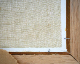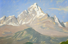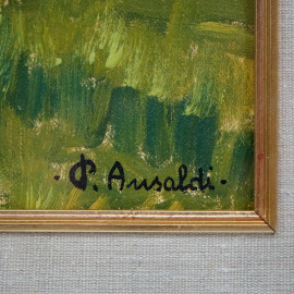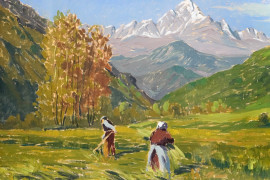 Paesaggio montano con contadini, olio su cartone telato, cm 40x60, entro cornice.