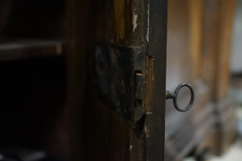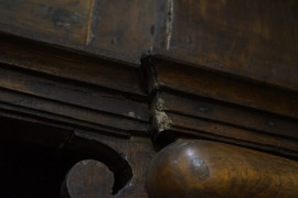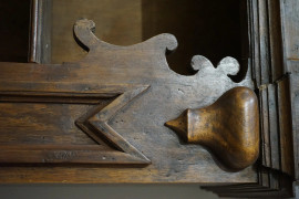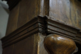 Antico mobile da farmacia in noce a doppio corpo, parte superiore a quattro lesene che delimitano tre sezioni con scaffaluture a giorno, parte inferiore con quattro sportelli, cm 236x265x48