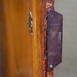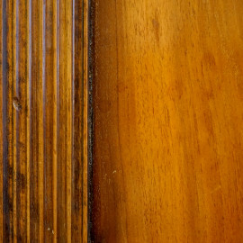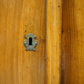 Armadio impiallacciato in noce e piuma di mogano, XX secolo, cappello aggettante modanato, fronte a due sportelli con lesene scanalate ai lati, piedi a mensola, cm h 206x135,5x52, (difetti).