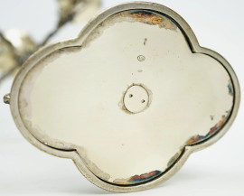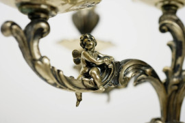 Candelabro in argento a cinque fiamme, bracci riccamente cesellati e sbalzati a volute, foglie e ricci con piccoli putti giocosi, seconda metà XX secolo, cm h 42x29, peso lordo gr. 2320 (appesantito).