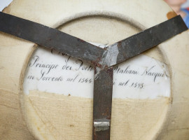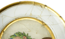 in porcellana a smalto bianco dipinta in policromia con finiture in oro zecchino, con menzionati al verso in nero i nomi degli effigiati.
