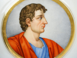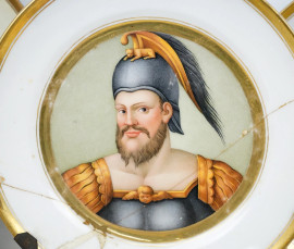 Collezione di 12 piatti in porcellana policroma raffiguranti Ritratti di Uomini illustri, XVIII-XIX secolo, diam. cm 21.5, (difetti e restauri)