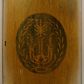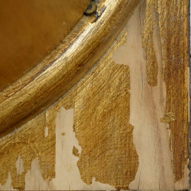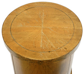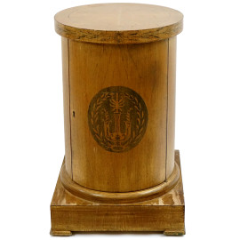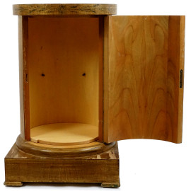 Comodino a cilindro in legno chiaro, ad uno sportello con decori tinti stile Impero, cm h 66x42x42, XX secolo, (difetti)