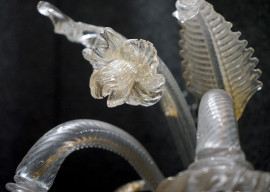 Coppia di appliques a due luci in vetro di Murano con inclusioni a foglia d'oro, cm h 45x30, (rotture)