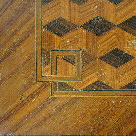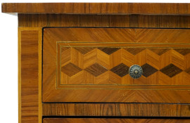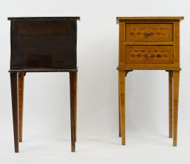 Coppia di comodini di linea Luigi XVI, in noce con intarsi geometrici, a due cassetti, poggianti su gambe troncopiramidali, XX secolo, cm 82x42x31