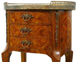 Piano in marmo rosso cinturato da ringhierina traforata, tre cassetti frontali, gambe sagomate riunite da un piano sagomato a fagiolo, finiture ornamentali in metallo dorato;