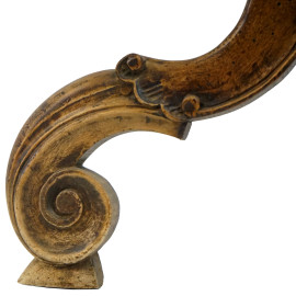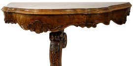 Coppia di consoles a mezzaluna in noce, XIX secolo, fusto centrale intagliato a volute terminante su tre piedi a ricciolo, cm h 67x87x34, (difetti)