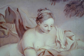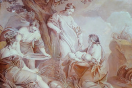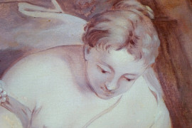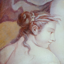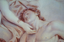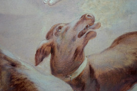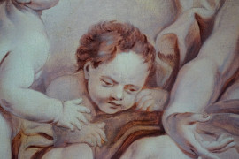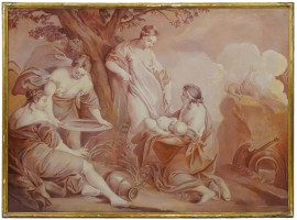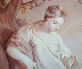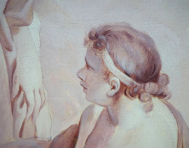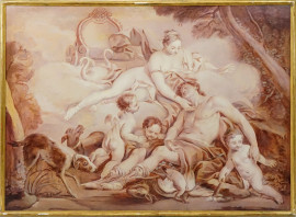 Coppia di dipinti raffiguranti Venere e Adone ed Il Ritrovamento di Mosè, olio su tela a grisailles, cm 144x103,5, XIX secolo, entro cornici.