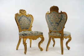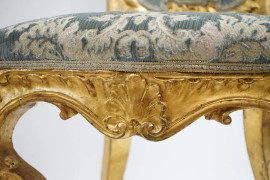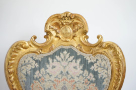 Struttura con intagli a motivi rocailles di raffinata esecuzione, schienale e seduta rivestiti in tappezzeria azzurra floreale, quattro gambe mosse, le posteriori lisce.