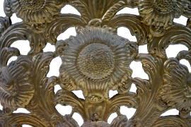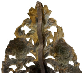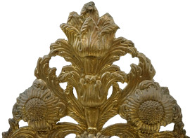 Coppia di palme in metallo sbalzato e dorato, del XVIII-XIX secolo, sagoma cuspidata costituita da volute vegetali variamente ritorte da cui emergono corolle fiorite, basi in travertino, alt. Tot. cm h 75
