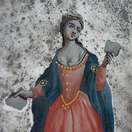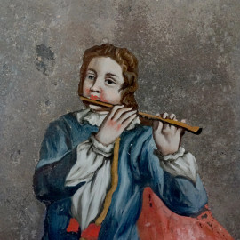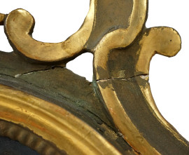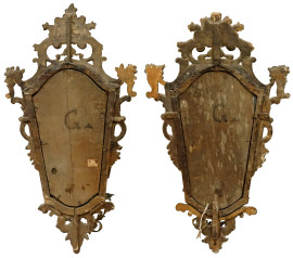 Coppia di specchierine ad applique, Venezia, XIX secolo, in legno dorato ed intagliato a volute, fiorellini e rocailles, specchi dipinti con figure policrome di gentiluomo e nobildonna, cm 87x50, (difetti e restauri)