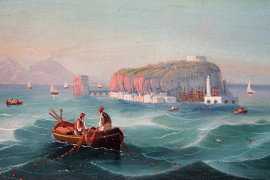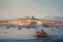 Coppia di vedute del golfo di Napoli, olio su tela, cm 23.5x63.5, inizi del XX secolo, entro cornice